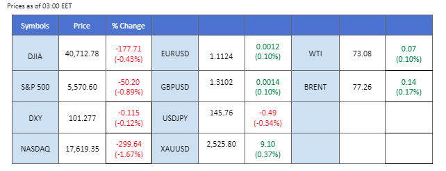 In the commodity markets, gold failed to hold its critical support level at $2,500, suggesting a potential trend reversal due to a stronger dollar and profit-taking sentiment. In contrast, oil prices have recorded a technical rebound after declining for the past four sessions, signalling a possible recovery from recent losses.