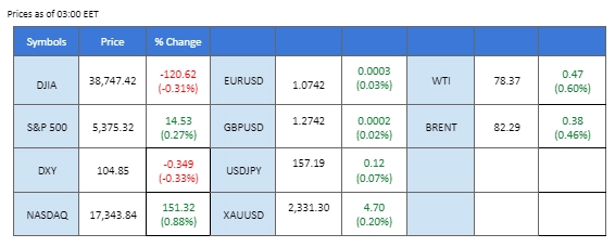 In the commodity market, gold prices eked out marginal gains, remaining subdued near the $2300 level. Oil prices were encouraged by an upbeat U.S. weekly crude report and optimistic projections from the OPEC+ monthly report, suggesting that oil demand will pick up later in the year.