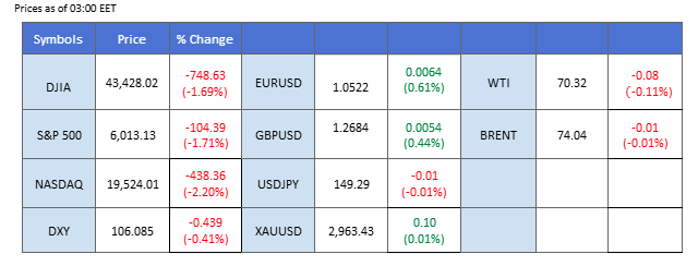 The U.S. dollar extended its decline, hitting a new 2025 low, as markets digested weaker-than-expected U.S. economic data last week despite the Fed’s hawkish tone in the latest FOMC meeting minutes. The fading confidence in the U.S. economy weighed not only on the greenback but also on Wall Street, which slumped further amid renewed tariff threats from the Trump administration, casting a shadow over global markets.