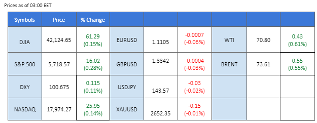 Wall Street remains at all-time highs, with major indexes standing pat, awaiting a catalyst to push them further. In the commodity market, gold is benefiting from a soft dollar and the prospect of continued Fed rate cuts, trading bullishly. Oil prices have also risen to their highest levels this month, aided by improved demand outlook following the Chinese central bank’s surprise rate cut of 10 bps on short-term repo rates.