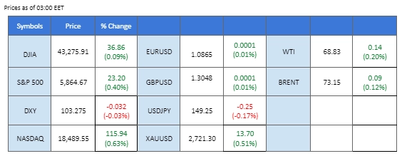 In forex, the U.S. dollar eased slightly but remained on a bullish trajectory. Meanwhile, China-proxy currencies, including the Aussie and Kiwi, were boosted by China’s new economic stimulus package, including a central bank rate cut. Traders are also eyeing the Bank of Canada’s upcoming interest rate decision on Wednesday, where a 50 bps rate cut is expected, likely weakening the Canadian dollar further.