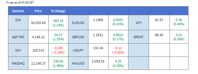 The US equity market witnessed a remarkable surge, as investors reacted to the latest economic data. The cooling inflation and loosening labour market had sparked expectations that the Federal Reserve could be moving towards the end of its aggressive interest rate hike cycle. According to the Bureau of labour statistics, the Producer Price Index (PPI) revealed a substantial decline in annualised price increases, with the crucial inflation gauge hitting its lowest level since January 2021. The Dow Jones Industrial Average, which rose by 1.1%, or 383 points, marking a significant rebound for the benchmark index.