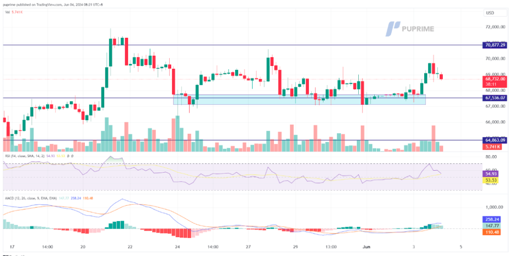 BTC prices jumped from its liquidity zone, suggesting a bullish signal for BTC, but selling pressure remains strong at the near $70,000 range. The RSI surged to above the 50 level, while the MACD has broken above the zero line, suggesting bullish momentum is forming.