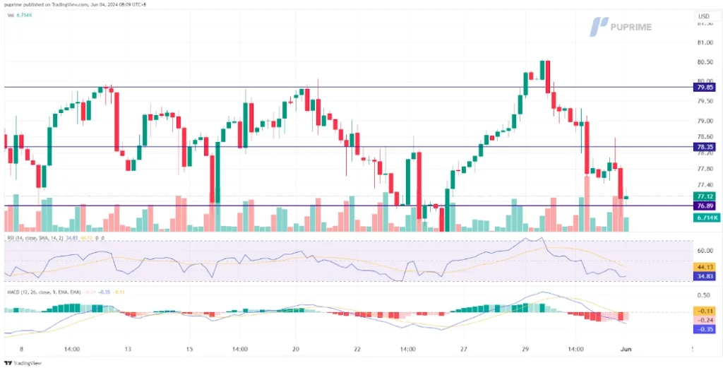 Oil prices declined by nearly 4% from their peak at near the $80 mark, suggesting strong bearish momentum. The RSI is close to the oversold zone, while the MACD has broken below the zero line, suggesting overwhelming bearish momentum.