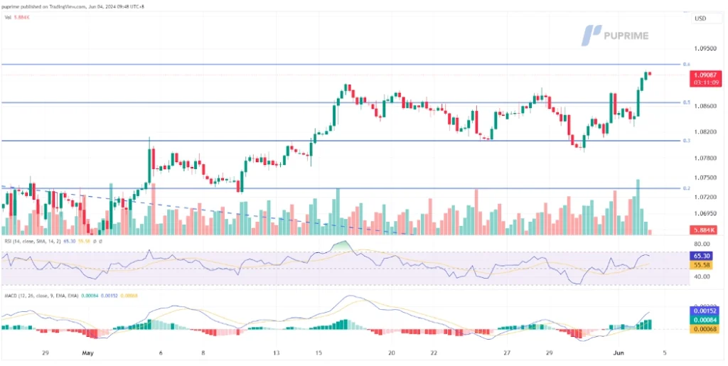 The EUR/USD broke above its short-term resistance level at 1.0855 level, suggesting a bullish bias for the pair. The RSI is climbing toward the overbought zone while the MACD has broken above the zero line, suggesting the bullish momentum is gaining.