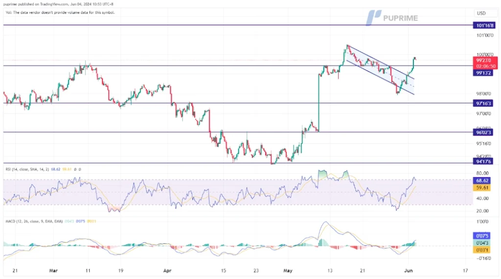 The U.S. 10-year treasury note has broken above its downtrend channel and is heading to the 100-market psychological level. The RSI has surged sharply into the overbought zone, while the MACD has broken above the zero line, suggesting strong bullish momentum.