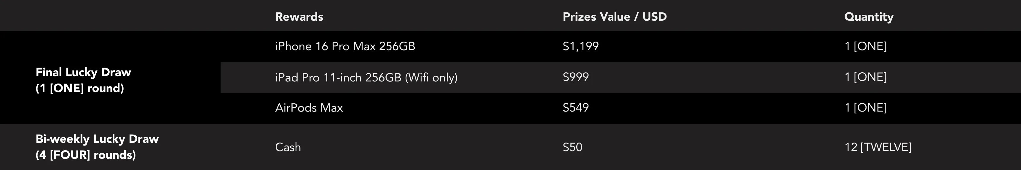 *Each Bi-weekly Lucky Draw will select 3 [THREE] clients, with each client receiving $50 USD cash.