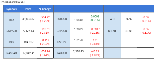 The US equity market experienced a sharp retreat as market volatility spiked to a three-month high, triggering panic selling. The bearish catalysts were primarily disappointing earnings reports from Tesla and Alphabet, which raised doubts about the sustainability of the 2024 rally driven by Big Tech and Artificial Intelligence. This led to a significant increase in the Cboe Volatility Index (VIX), known as Wall Street’s fear gauge, which rose to 18.46, the highest level since late April. Nvidia, a key player in the market’s gains this year, fell 6% on Wednesday but remains up about 130% for the year. Despite the increase, the VIX index remains below the peaks reached during recent market selloffs, such as the October spike to 23.