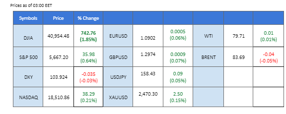 In the commodity market, gold has risen to its zenith above the $2480 territory on rate cut expectations, while oil prices have been lacklustre due to a lack of catalysts. Additionally, Bitcoin prices topped $65,000 as positive sentiment continues to drive the cryptocurrency higher, bolstered by hopes that Donald Trump, a crypto-friendly U.S. presidential candidate, will win the election.